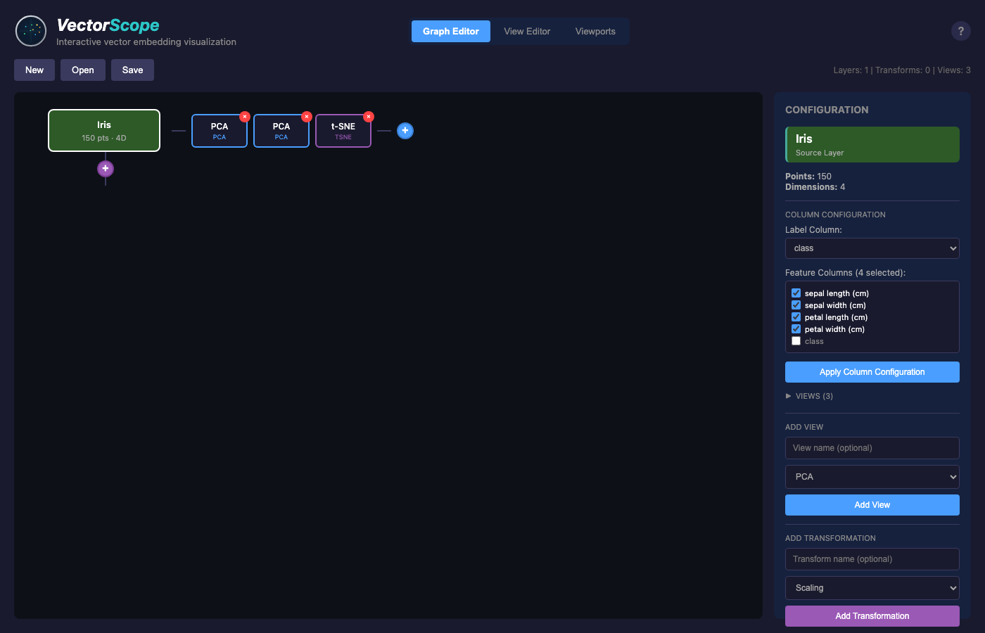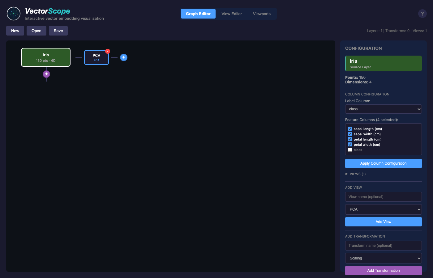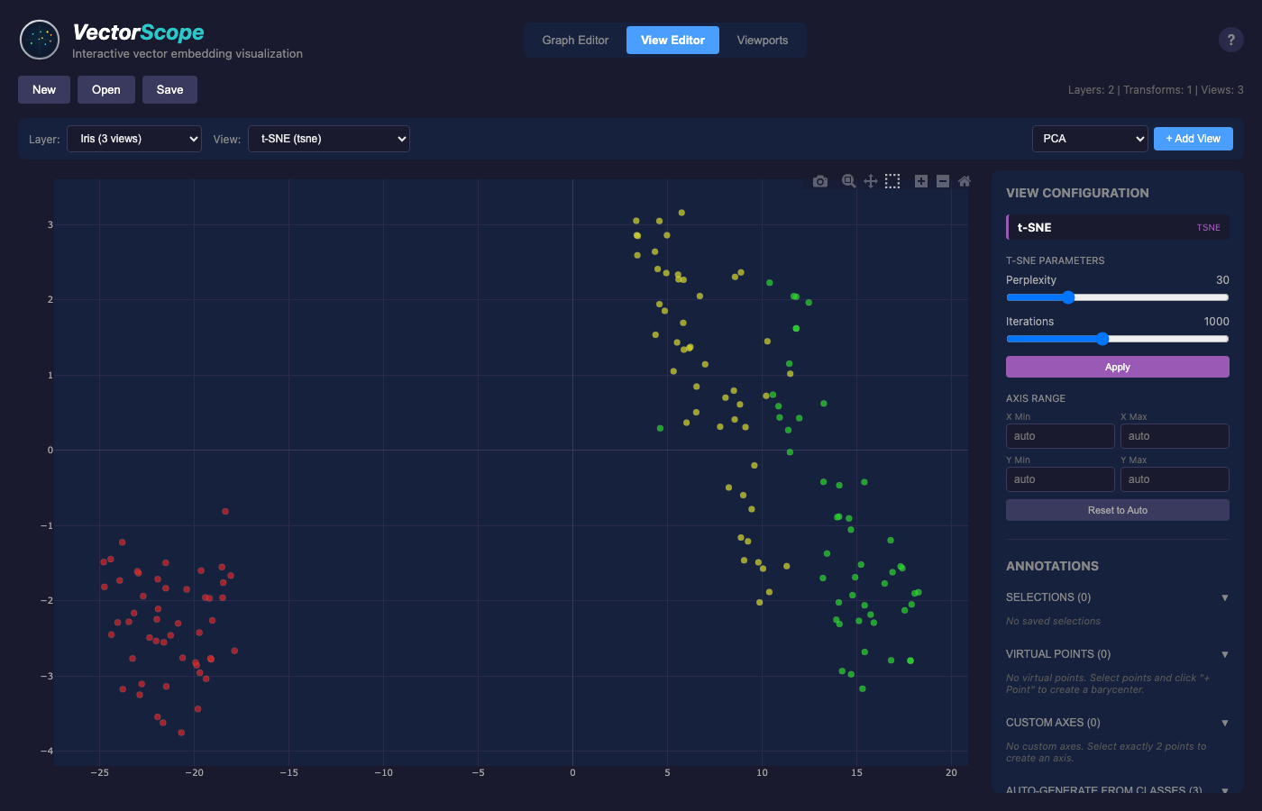 Select a view from the dropdown (e.g., “Iris: PCA”)