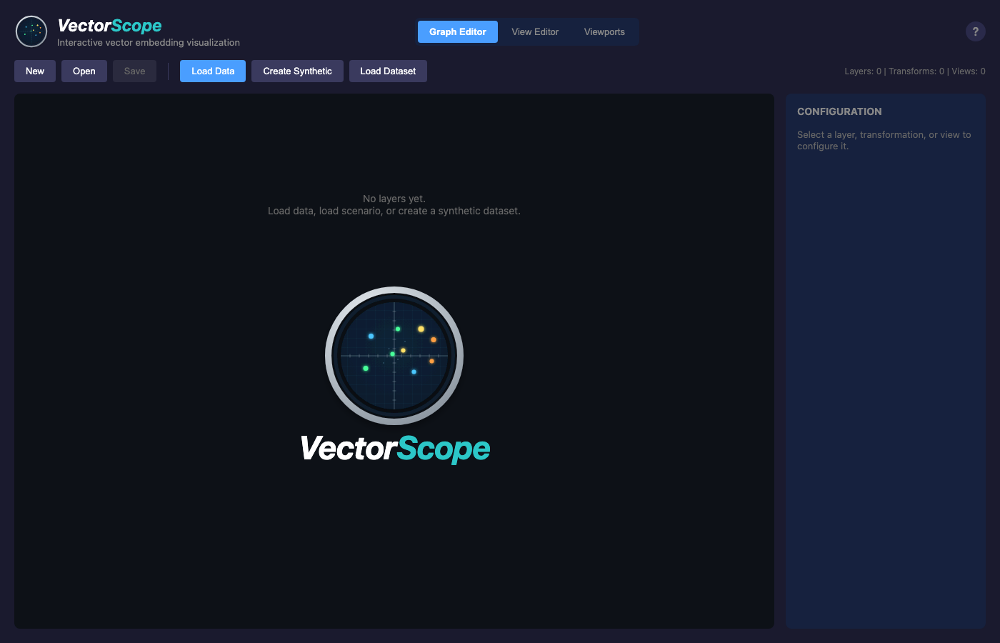 This single command starts the backend API and serves the frontend UI together. Open http://localhost:8000 in your browser. You should see the VectorScope interface with the logo and an empty graph editor.
